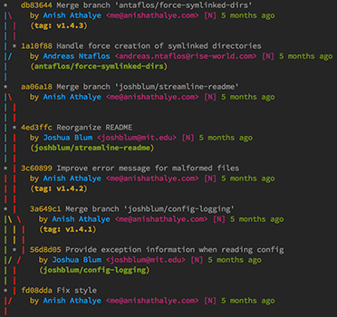 Date: Thu Sep 10 20:24:56 2015 -0400 Initial commit ``` * `git graph` is the single most important command (alias) to remember * It will be super helpful in understanding what is going on * Use it often ??? * Commit messages * Commit hashes * Branches / HEAD * Graph / parents --- # Branching and Merging * Used to work on different topics concurrently (among other stuff) ```bash git checkout -b optimization # do stuff, editing files and making commits git checkout master # do some work on master, editing files and making commits # when ready to merge in changes from optimization: git merge optimization ``` * Dealing with merge conflicts --- # Remotes * Interact with other Git repositories ```bash git remote add origin https://github.com/username/reponame ``` * Push changes ```bash git push origin master ``` * Fetch changes ```bash git fetch ``` * Fetch changes and merge ```bash git pull ``` --- # Cloning * Getting code from a remote ```bash git clone https://github.com/git/git ``` ??? * Try it --- # Organizing version history * Best way to learn how to organize version history and have good workflows? * See how other people do it! * https://github.com/git/git * Things can get pretty complicated - visualize as a graph! .center[  ] --- # Beyond the basics * Customizing Git * `~/.gitconfig` * See https://go.hackmit.org/gitconfig as an example * Git status in your shell prompt * Learning `git mergetool` * Nice tools for handling merge conflicts like Vimdiff * Open-source workflows * Merging, rebasing, tagging * Using GitHub * Issues, Pull Requests, Wiki, ... --- # If something goes wrong * `git reflog` * Read about it online * Google / StackOverflow * Other people have probably had the same issue --- # Resources * `git help